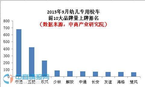 据中商产业研究院大数据库数据显示:2015年9月中国幼儿校车前10大品牌量上牌量排名中,宇通排第一位,排第二位是五菱,其它前10位分别是东风、少林、解放、中通、长安、友谊、海格等……