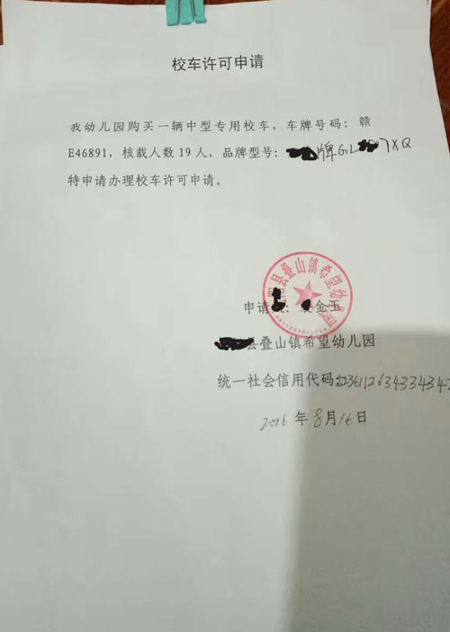 一直有很多幼儿园园长想购买幼儿园校车但是不知道怎么去申办手续,其实很简单。首先是要给教育局的安全部递交一份校车许可申请: