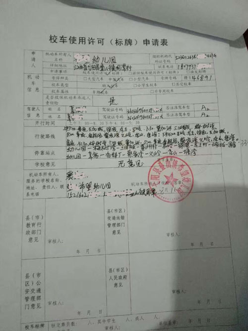 然后再填一份校车线路牌的许可申请:1.教育行政部门,2.交通运输管理部门,3.公安交通管理部门,4.人民政府,需要这些部门同意盖章。